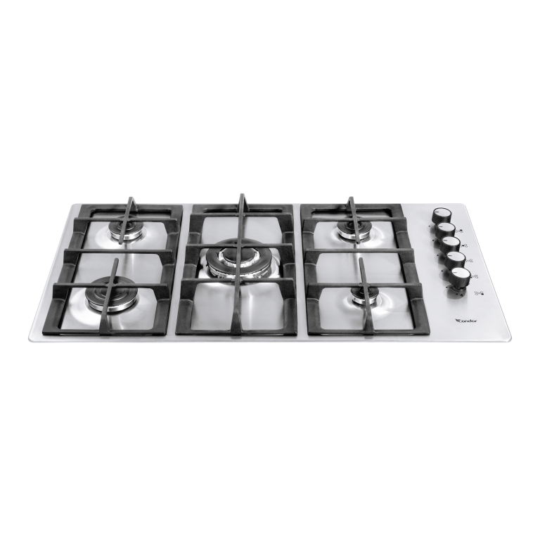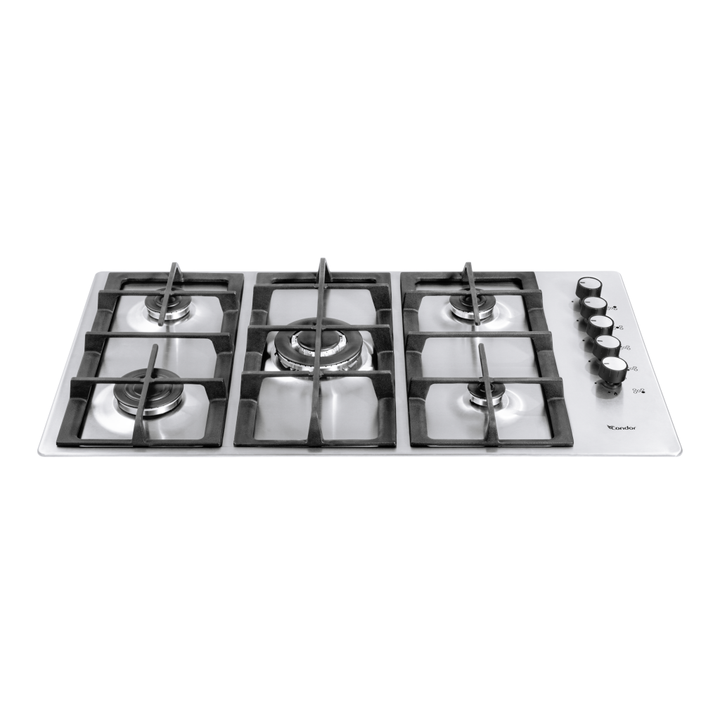90 cm Hob, 5 Burners – Stainless Steel – Enamel Pan Support – Auto Ignition – Full Safety – Triple Burner – Side Knobs